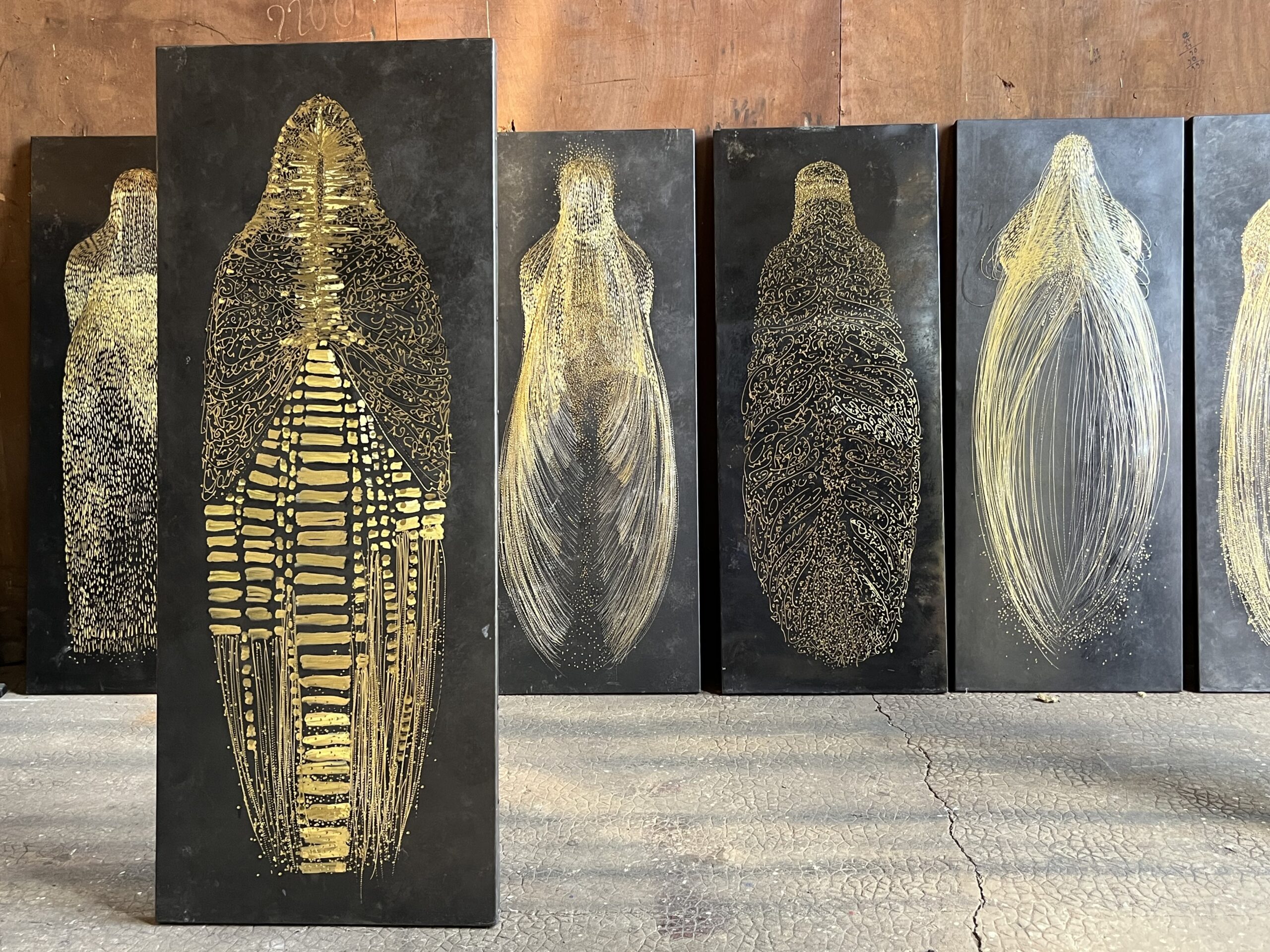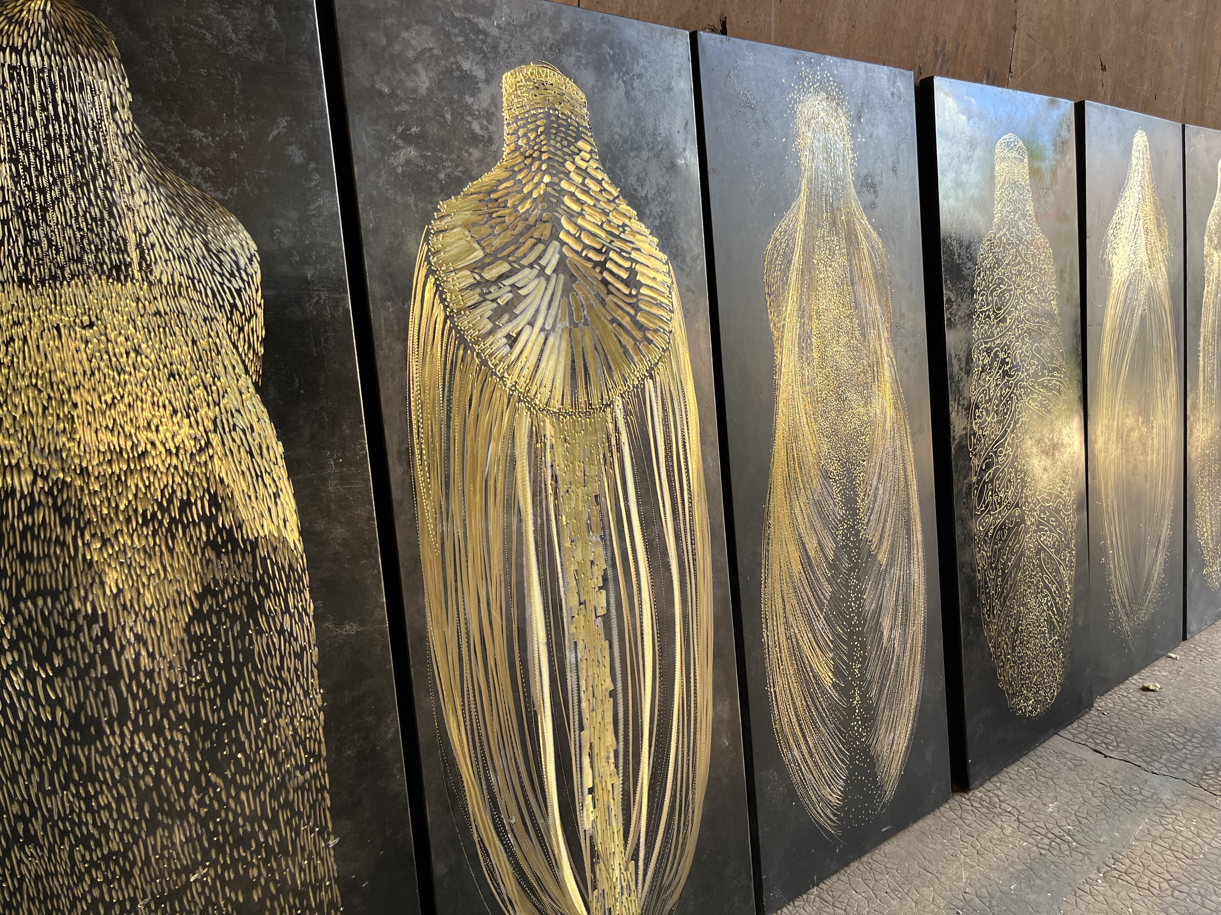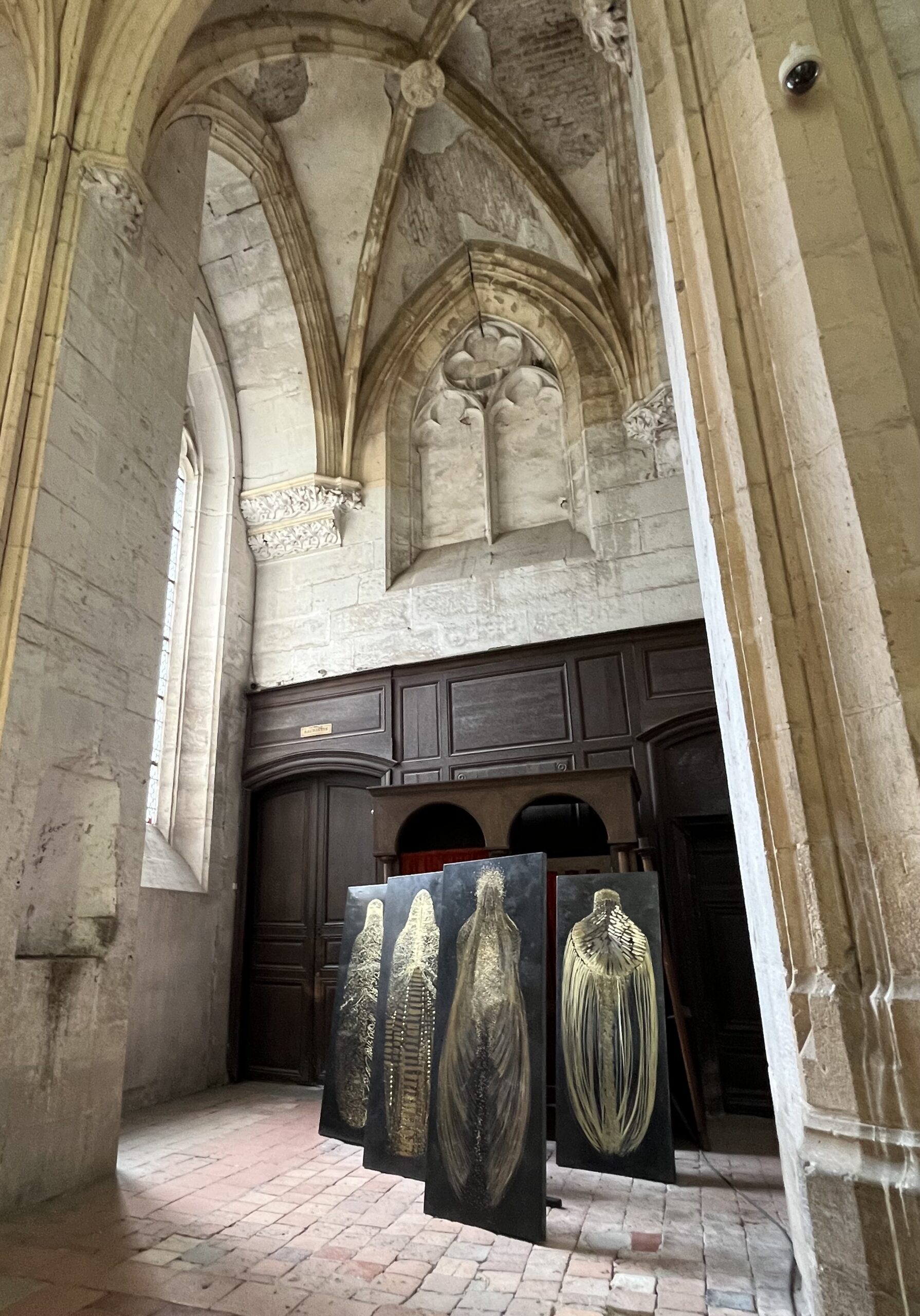 Elles sont une invitation, un questionnement, un dévoilement. Les 4 Psychés nous renvoient les reflets lumineux de notre intériorité, sous formes archétypales de Voiles, de chrysalides. Les reflets de notre intériorité tissés de fils d’or.